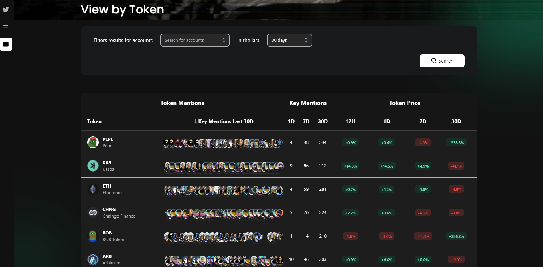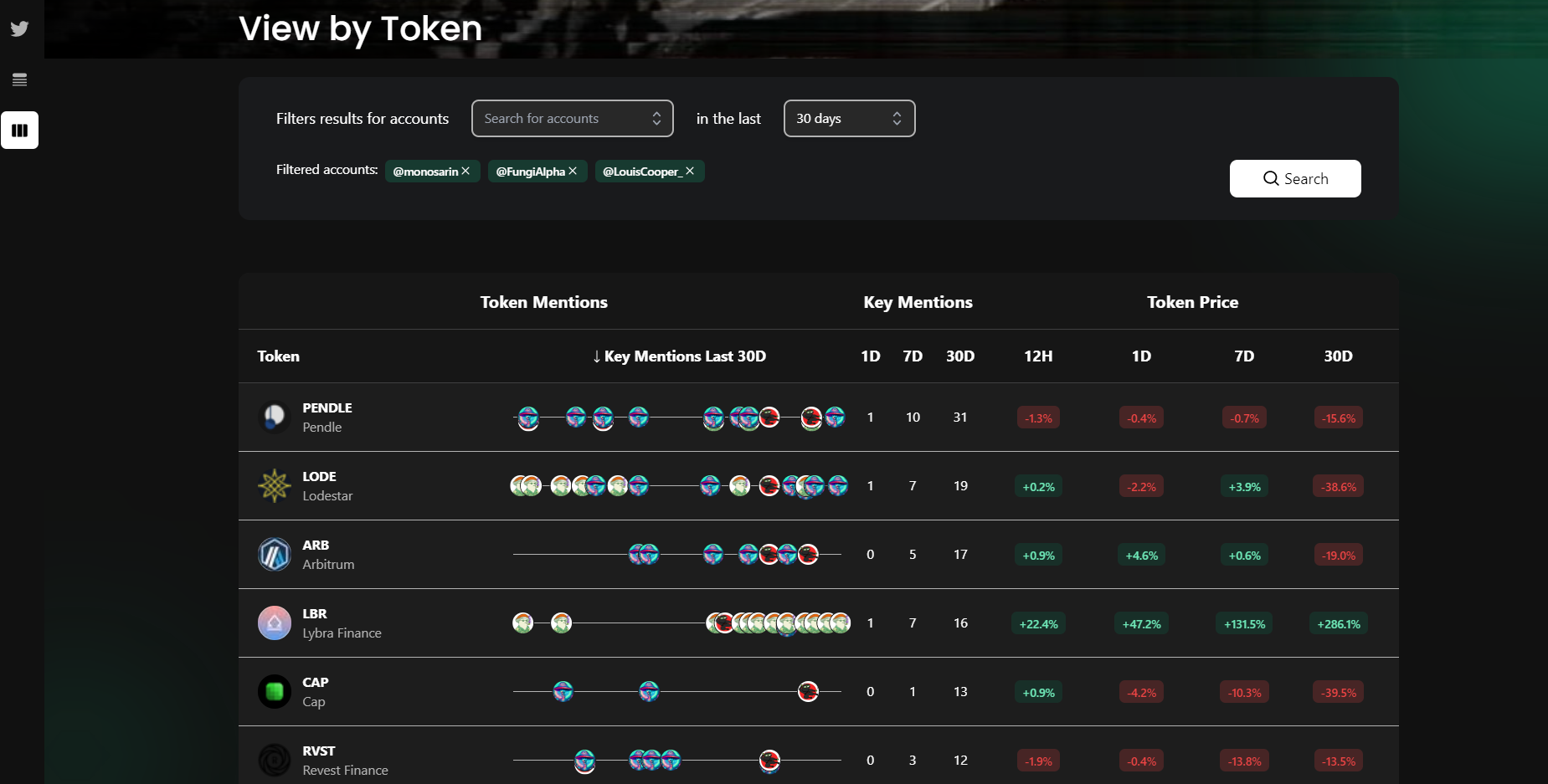 This data shows you mentions by key accounts by token. For each token, you see the number of mentions in the last 1, 7, and 30 days along with how the token price changed over multiple time periods (0.5, 1, 7, and 30 days) until today.